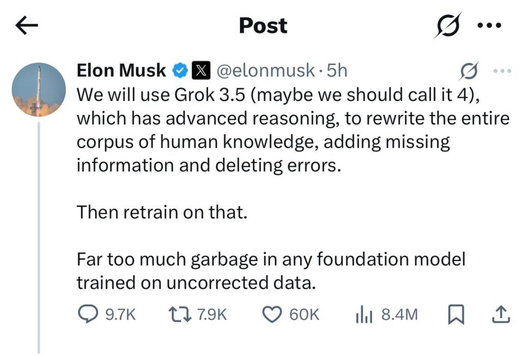 Elon Musk pulled back the curtain in a recent online post, sharing how he plans to ‘rewrite the entire corpus of human knowledge, adding missing information and deleting errors’. In doing so he blew up the narrative that AI is a neutral tool, which just interprets data. Because behind the ‘illusion of intelligence’ marketing ploy, is a strategy to control knowledge; access to knowledge, how knowledge is framed and delivered, how children are educated and how adults are ‘retrained’. And who pulls and writes the prompts, rules and strings which deliver ‘re-education’? Why our tech bro billionaire overlords who of course have our best interests at heart!